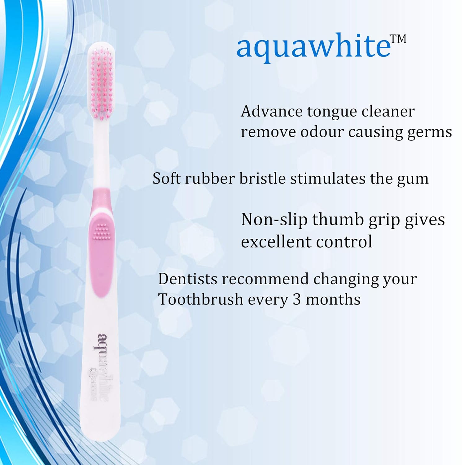 Rubberized non-slip thumb grip provides best control of movement. Its unique tongue cleaner head helps to remove bad breath bacteria to give you the feeling of freshness and a hygiene cap comes along with it so that toothbrush remains clean and hygienic for use. Aquawhite is the dentists choice oral care brand.