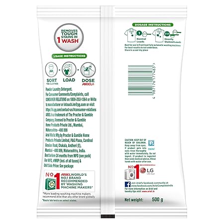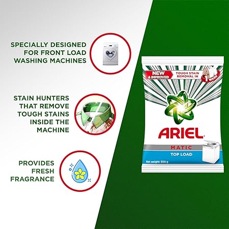Ariel Matic Top Load Detergent Powder gives you tough stain removal for a bright clean in just one wash. Specially designed to be used in top-loading machines, the detergent powder offers brilliant stain removal for full loads. The oxi-stain fighters provide an impeccably clean wash after wash. It also provides deep-down cleaning and long-lasting freshness. Ariel Matic's cutting-edge technology provides impeccable cleaning for all your clothes and removes tough stains like juice, chocolate, tomato, butter and ghee along with maintaining the brightness of the clothes. So what are you waiting for? Go ahead and buy this product online today!