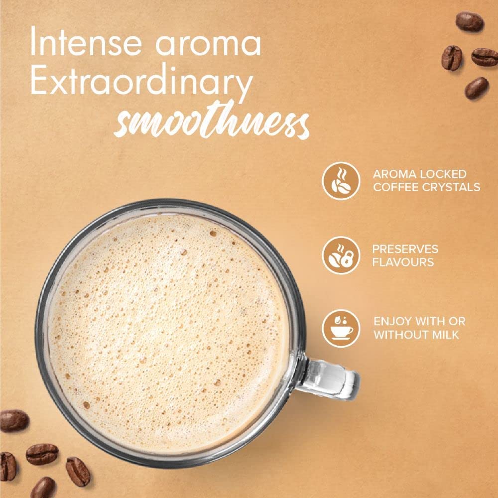 The new Bru Gold Flavoured Coffee range elevates your coffee experience. Indulge in the delicious and enticing taste of Bru Gold Caramel, the ultimate flavoured coffee experience for those seeking a touch of luxury. In every sip, you will experience the infusion of luscious caramel, perfectly balanced to enhance the rich flavour of freeze-dried coffee. At Bru, we source the choicest Arabica & Robusta beans from South India which undergo our meticulous freeze-drying process. Our freeze-drying process ensures that each granule of coffee bursts with intense aroma and flavour. Bru Gold Caramel is a versatile blend that tastes delicious both hot and cold