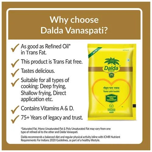 Dalda Vanaspati is semi solid, off-white in color, slightly granular in consistency and contains a pleasant aroma and tasteDalda Vanaspati is prepared from partially-hydrogenated permitted vegetable oils, and changed to solid form by hydrogenation. It is white and grainy (danedaar) in texture and is favored for deep-frying.