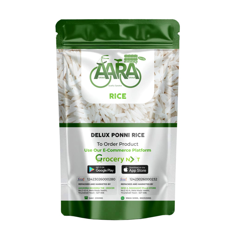 Delux Ponni rice It is a thin and medium grain .It is light in weight and soft and fragrant. It produces good bacteria in the body. Also keeps the heart and hemoglobin running smoothly. டியூலக்ஸ் பொன்னி அரிசியானது மெல்லிய மற்றும் நடுத்தர தானியம் ஆகும் .இது லேசான எடையும் மென்மையானது மற்றும் நறுமணம் மிக்கது. இது உடம்பில் நல்ல பாக்டீரியாக்களை உற்பத்தி செய்கிறது. மேலும் இதயம் மற்றும் ஹீமோகுளோபினை சீராக இயங்க வைக்கிறது.