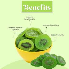 Dried Kiwi fruit is rich in Vitamin C, Vitamin K, Vitamin E, and Potassium which are good for the body’s immune system, preventing blood clots and protecting the body from heart problems. கிவி பழத்தில் உடம்புக்கு அதிக நோய் எதிர்ப்பு சக்தி தரக்கூடிய வைட்டமின் சி, வைட்டமின் கே, வைட்டமின் ஈ, மற்றும் பொட்டாசியம் போன்ற பல வகையான சத்துக்கள் நிறைந்து இருப்பதால் ரத்தம் உறைவதை தடுக்கிறது மேலும் இதய பிரச்சினையில் இருந்து உடலை பாதுகாக்கிறது.