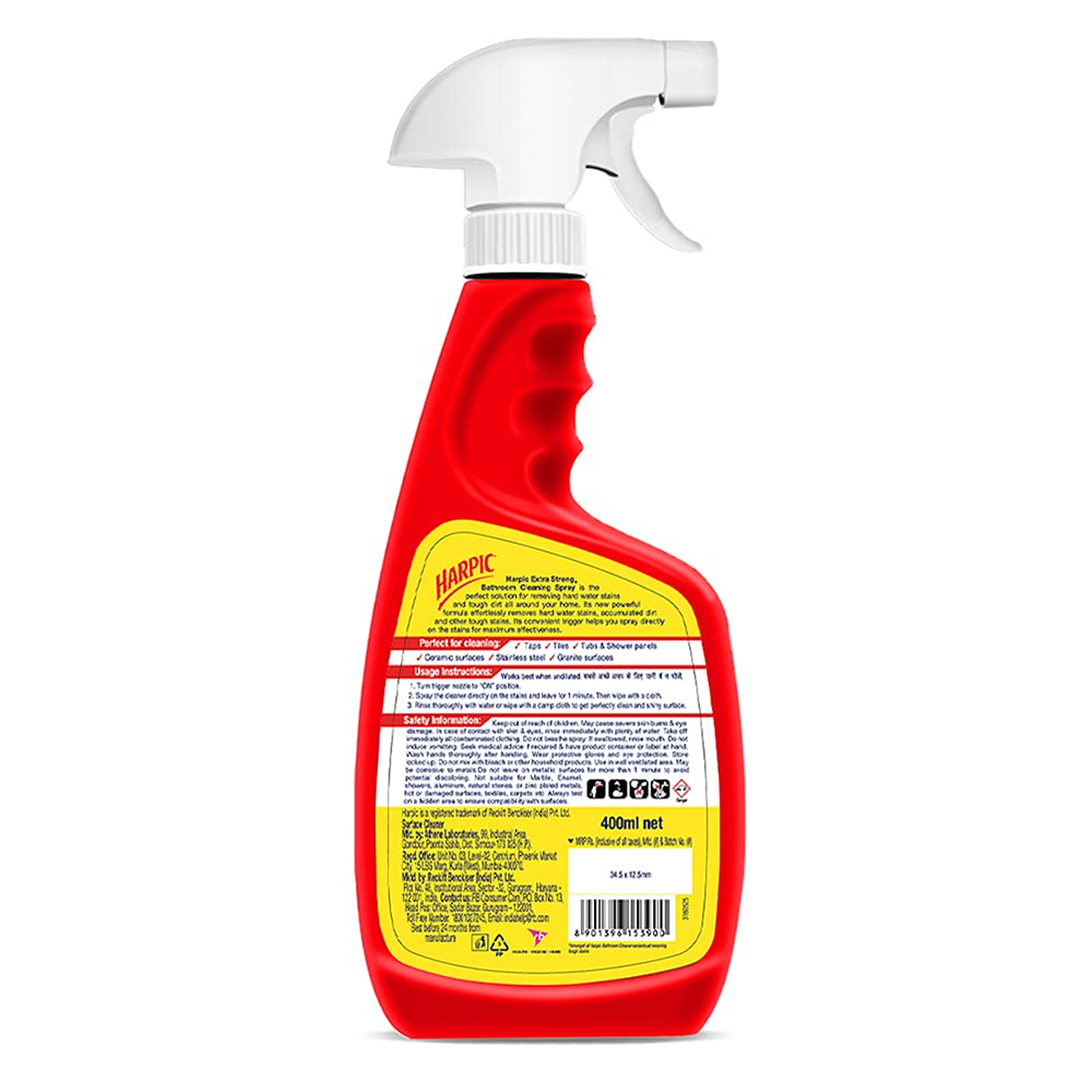 Harpic Extra Strong Bathroom Cleaning Spray deep cleans bathroom surfaces with unbeatable shine every time. The thick liquid provides a powerful deep cleaning action that works instantly to lift away the toughest bathroom dirt, limescale deposits and scum. It effectively disinfects your bathroom, killing up to 99.9 percent germs^ and leaving your faucets, walls and other surfaces visibly clean. With its unique fragrance, it is a dose of freshness for your bathroom every time you clean it. This product can be used as an effective basin cleaner and also a tile cleaner for a fresh, shiny bathroom. Harpic Bathroom Cleaning Spray has an easy to use spray bottle to reach even the toughest spots. It is suitable to be used on Tiles, Taps, Tubs & Shower panels, Ceramic surfaces, Stainless steel and Granite Surfaces. No matter how hard you try to keep it clean and healthy, bathroom remains the most illness causing area in the house