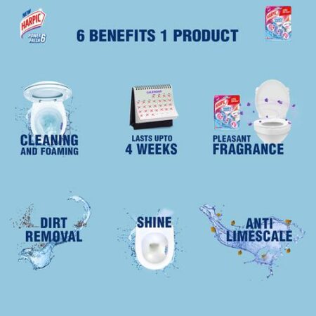 SHINY TOILET: Harpic rim block gives you a shiny toilet LASTS UPTO 4 WEEKS: Toilet Cleaner Rim block that cleans and freshens the toilet for up to 4 weeks WAVE SHAPED: Unique wave shaped block with anti-limescale and easy dirt removal properties COLOURFUL TOILET CLEANER: Colourful and aesthetically pleasing in the bowl PLEASANT FRAGRANCE: Comes in a pleasant floral delight fragrance