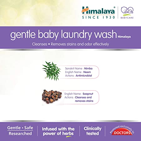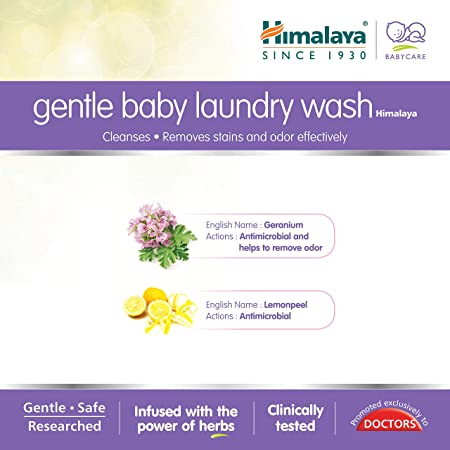 Himalaya Gentle Baby Laundry Wash is specially formulated with naturally derived cleansing agents and herbs with antibacterial property that are effective yet gentle on baby’s clothes. Enriched with Soapnut extracts, well-known for stain removal properties, this formulation is tough on stains and odor. The antibacterial properties of Neem, Geranium, and Lemon effectively help sanitize baby’s clothes. This laundry wash maintains the softness of the fabric and has a fresh and mild fragrance post wash, without leaving detergent residue. Our biodegradable Baby Laundry Wash is gentle on your baby’s clothes and gentle on the environment too!