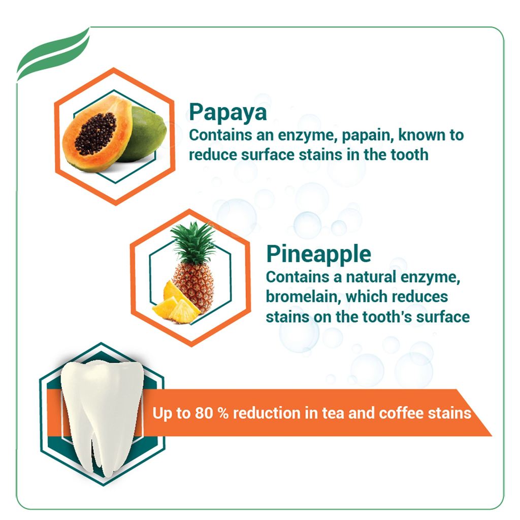 Himalaya’s Stain Removal Toothpaste is an advanced herbal formulation that uses Plant Enzyme Technology from Papaya and Pineapple, which removes up to 80% tea and coffee stains in 12 weeks and reduce further stain build-up on regular use. The powerful blend of Papaya and Pineapple enzymes help prevents plaque build-up and provides benefits such as: