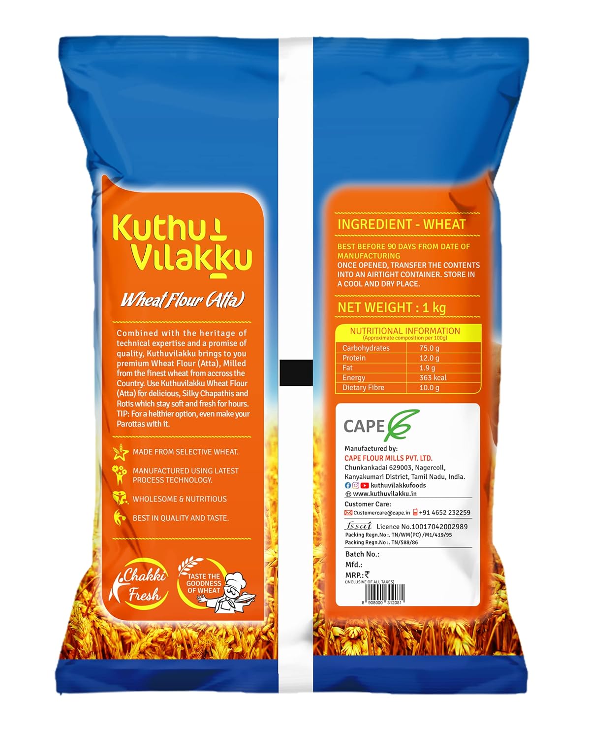 Kuthuvillakku whole wheat flour is widely considered healthier. It’s a good source of protein, fiber, and a variety of vitamins and minerals. made from the finest wheat grains.Wholesome Goodness of High Dietary Fibre & Protein, Healthy Choice: 100% Chakki Atta ground to perfection. No added maida to ensure maximum health benefit.Softer Chappathi & Roti: Maximum water absorbing Atta ensures softer & tastier roti’s & chappathi’s.
