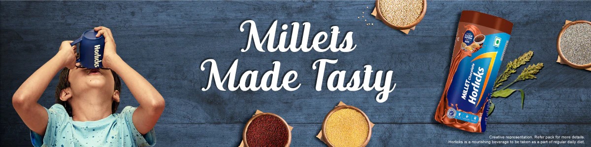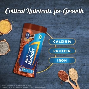 -Millet Chocolate Horlicks is made from the goodness of multi-millets like Finger Millet (Ragi), Sorghum (Jowar), Foxtail Millet (Kanngani) and Pearl Millet (Bajra).