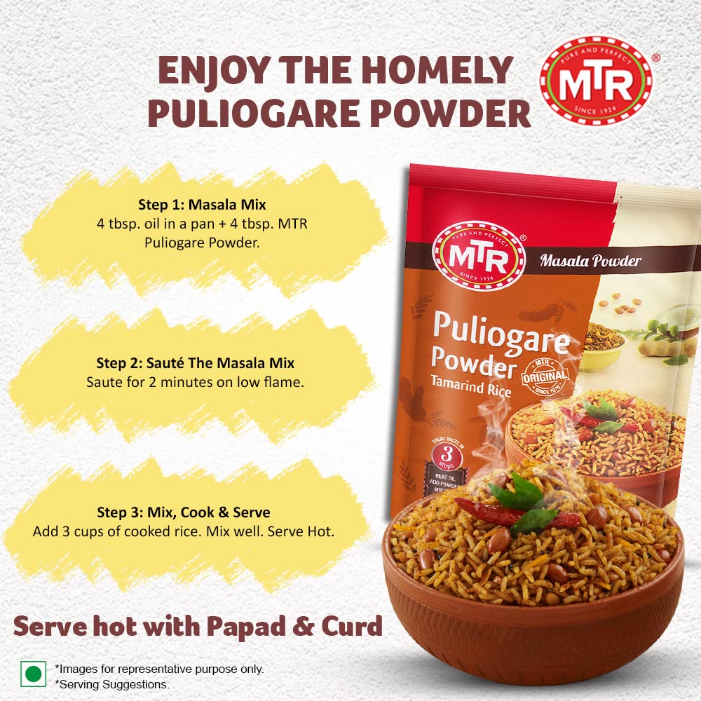 MTR Puliogare Powder is completed of the superiority of well ingredients. Puliyogare or Tamarind Rice is a sharp spicy South Indian Rice range, which is identified for its long shelf life and great journey food. It will give very peppery and tangy flavour to the rice. This dish is regularly served with chutneys, pappadums, and pickles.