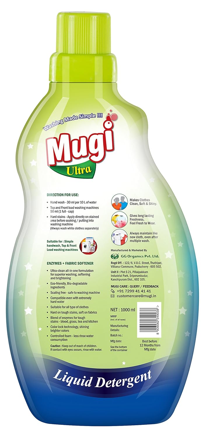 Mugi Ultra Liquid detergent is suitable for washing in both Hand and Washing Machine. It removes Stains and the fragrance is good.Mugi Ultra Liquid detergent with an enzyme action.Mugi Ultra contains biodegradable cleaning agents like Anionic and Non-ionic surfactants, active multi-enzymes, buffered salts, fabric conditioner, fragrance, brightener, preservative, and colorant.