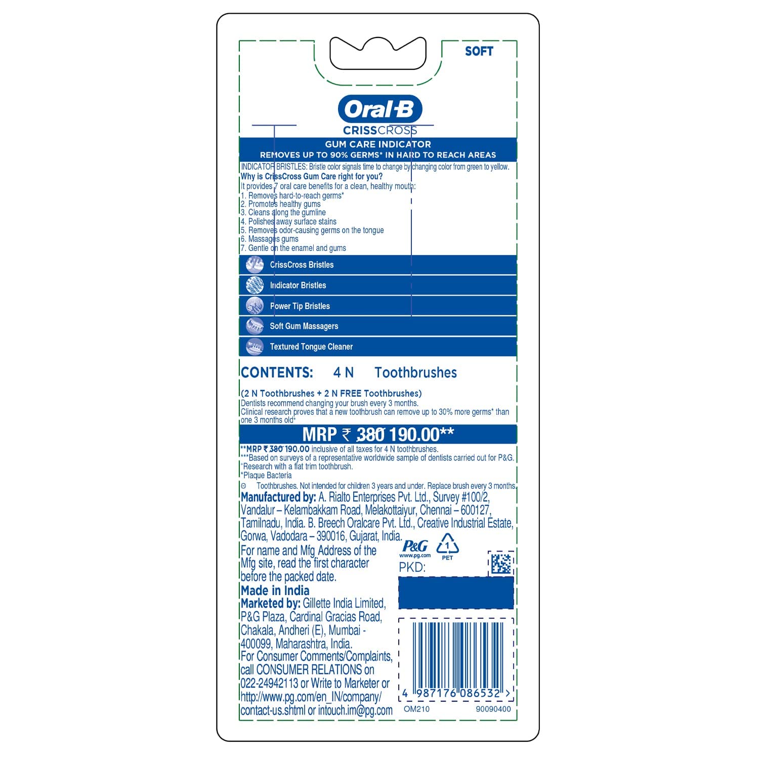 Oral -B Criss Cross Toothbrush – Buy 2 get 2 Oral-B is the World’s No. 1 Toothbrush brand used and recommended by dentists worldwide, which brings to you and your family revolutionary brushing solutions with best in class technology to ensure you and your family get healthier and cleaner mouth. Oral-B Criss Cross Anti-Plaque Toothbrush is designed to reduce up to 90% plaque in hard-to-reach areas* to give you a clean and healthy smile. Extra-long Power Tip bristles hit areas where plaque builds up, and CrissCross bristles flex and straighten to get in-between teeth while still being gentle on your gums.