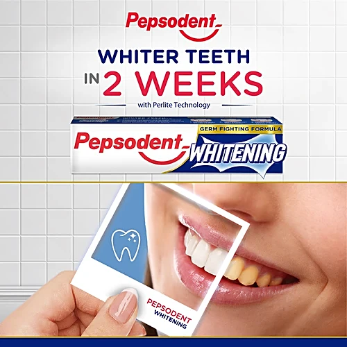 Stains on your teeth make them yellow? Upgrade your oral care routine with Pepsodent Whitening Toothpaste today. Pepsodent Whitening Toothpaste is clinically proven to bring back the natural whiteness of teeth in 2 weeks. Pepsodent Whitening Toothpaste contains Perlite – an effective polishing agent known to remove stains and whiten teeth. You can check the improvement in the whiteness of your teeth with the shade card attached in the pack.