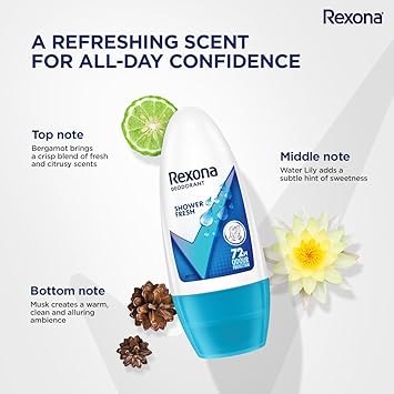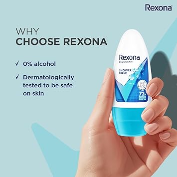 Rexona Shower Fresh Underarm Odour Protection Roll On for Women is a modern clean floral fragrance, with a fresh combination of fruity, woody, musky notes that leave you fresh all day long. Its fresh scent keeps you smelling clean and feeling confident all day long. Whether you're scaling a mountain, running for the bus or train, presenting to your boss or going for your first job interview, you can be confident of the best protection. So what are you waiting for? Buy the product online at the best rate, right here!
