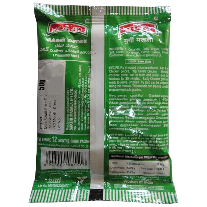 Sakthi Chicken Masala gives you a thick, rich and tasty chicken gravy. This masala can also be used in preparing vegetable gravies. It is a mix of aromatic and flavourful spices that adds a unique flavour to your dishes. This masala pairs perfectly with the chicken making it delightful. The cloves, cinnamon and peppercorns used in this mix are known to improve digestive complaints and immune functions. It is added to any chicken curry which makes it highly delicious.