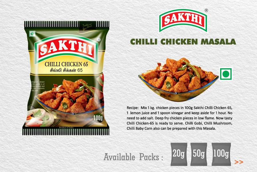 Sakthi Chilli Chicken 65 Masala uses the best quality spices and herbs in the preparation of masala. Use the masala to add a savouring taste and aroma which will make your Chilli Chicken 65 rich in taste. Grab this today to give a tantalizing and mouth-watering taste to your food.