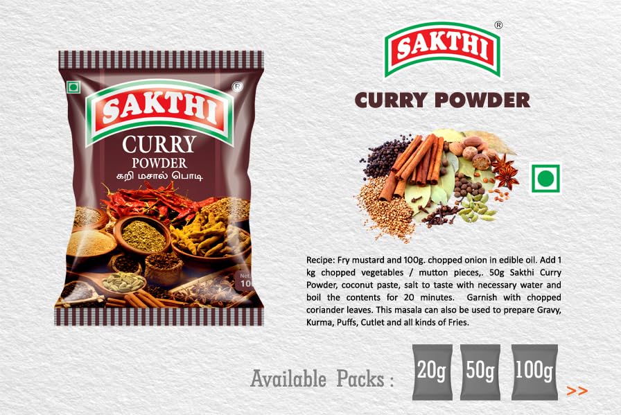 Sakthi Masala Curry powder is made from the purest of spices of our country. It is a delicate blends of numerous spices, just a rush of it a dish of vegetables and meat, poultry or fish is enough to convert it into a gourmet’s delight. This masala can also be used for Gravies, Kuruma, Puffs, Cutlet and all kinds of Fries.