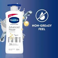 When your skin is very dry, it can tighten and develop micro-cracks in the upper layer, leading to irritation and itchiness. Vaseline Advanced Repair lotion relieves dryness from the first application with faster moisturization for visibly reduced dryness within 24 hours. It contains glycerine and petroleum jelly, which are great ingredients for naturally dry skin. Glycerine and micro-droplets of petroleum jelly work together to lock in moisture and provide intensive moisturization to help heal dry skin and repair the skins natural barriers.