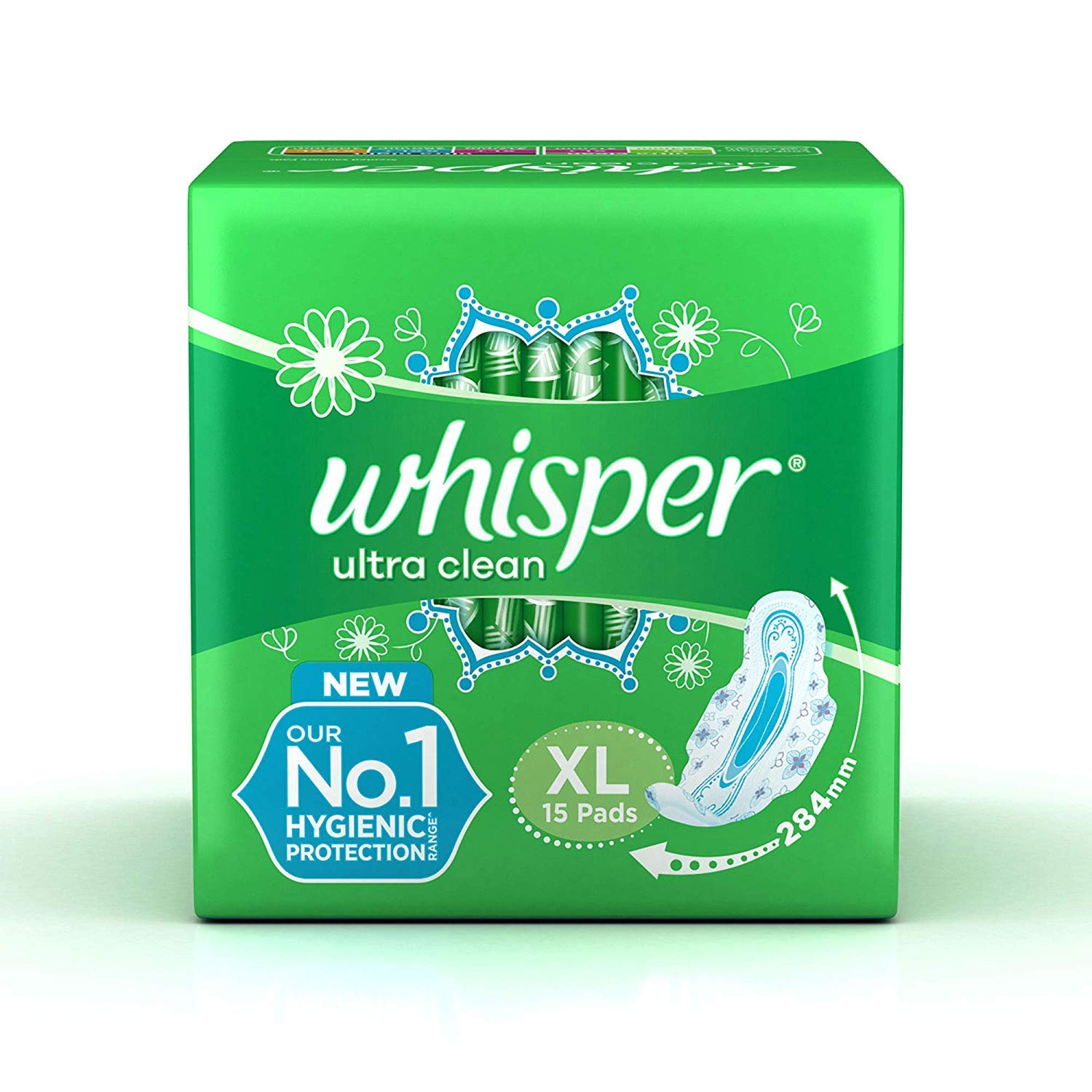 Whisper Ultra Clean XL Whisper Ultra Clean gives you our No. 1 Hygenic Protection. It has a germ-lock technology which locks upto 100% wetness, odour & germs. Its nearly 40% Longer for a longer lasting coverage so that you can be worry free during your periods.