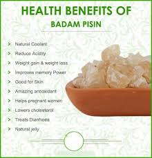 Badam Pisin Heartburn (acidity) such as stomach pain caused by digestive disorders can be cured by soaking almond resin and eating it. The minerals in almond resin promote skin and bone health and mineral deficiency in the body. Heals dry, cracked skin. பாதாம் பிசின் நெஞ்செரிச்சல் (அசிடிட்டி) செரிமான கோளாரால் உண்டாகும் வயிற்று வலி போன்றவை நீங்க பாதாம் பிசினை ஊறவைத்து சாப்பிட்டு வர குணமாகும். பாதாம் பிசினில் உள்ள தாதுக்கள் தோல் மற்றும் எலும்புகளின் ஆரோக்கியம் மற்றும் உடலில் தாது பற்றாக் குறையை போக்குகிறது. தோல் வறட்சி, வெடிப்புகளை குணமாக்கும்.