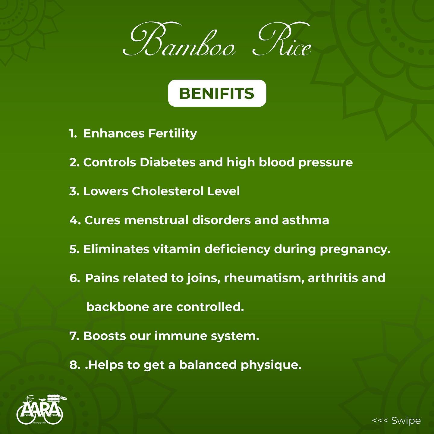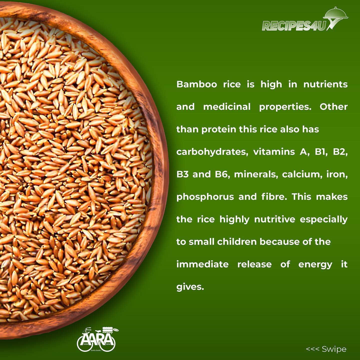 Bamboo rice is high in nutrients and medicinal properties. Other than protein this rice also has carbohydrates, vitamins A, B1, B2, B3 and B6, minerals, calcium, iron, phosphorus and fiber. This makes the rice highly nutritive especially to small children because of the immediate release of energy it gives. மூங்கில் அரிசி ஆனது அதிகமான ஊட்டச்சத்துகள் மற்றும் மருத்துவ குணங்களை கொண்டது.புரதத்தைத் தவிர இந்த அரிசியில் கார்போஹைட்ரேட்டுகள், வைட்டமின்கள் ஏ, பி 1, பி 2, பி 3 மற்றும் பி 6, தாதுக்கள், கால்சியம், இரும்பு, பாஸ்பரஸ் மற்றும் நார்ச்சத்து ஆகியவை உள்ளன. இது உடனடியாக தனது ஆற்றலை வெளிப்படுத்துவதால், இந்த அரிசி குழந்தைகளுக்கு அதிக சத்தானதாக அமைகிறது. For more info visit our page on Instagram & Facebook https://www.instagram.com/p/CDFwemwh64a/ https://www.facebook.com/AavanaRavana/ Kindly have a look on below DESCRIPTION for recipes of this rice
