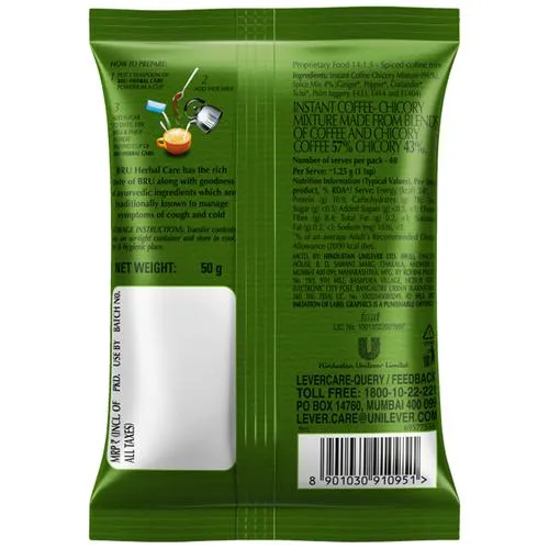 Bru Herbal Care is an instant coffee combined with the goodness of Ayurvedic ingredients, new from the House of Bru! With decades of experience, herbal care coffee is expertly crafted by Bru to give you the experience of the authentic taste of coffee with the benefits of Ayurvedic ingredients. Bru Herbal Care has Dry Ginger, Black Pepper, Coriander Seeds & Tulsi which are traditional Ayurvedic ingredients known to alleviate symptoms of cough and cold. These Ayurvedic ingredients are carefully blended with Instant Coffee so that all you need to do is add hot milk and sugar to enjoy a delicious cup of Bru Herbal Care.