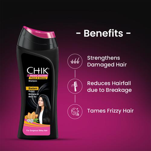 Chik Thick & Glossy Black shampoo contains the goodness of Black Tea, Badam protein & Bhringraj oil. It helps to enhance hair shine & strengthens your hair thereby giving you thicker looking & glossy hair. Get gorgeous looking shiny hair with every wash.