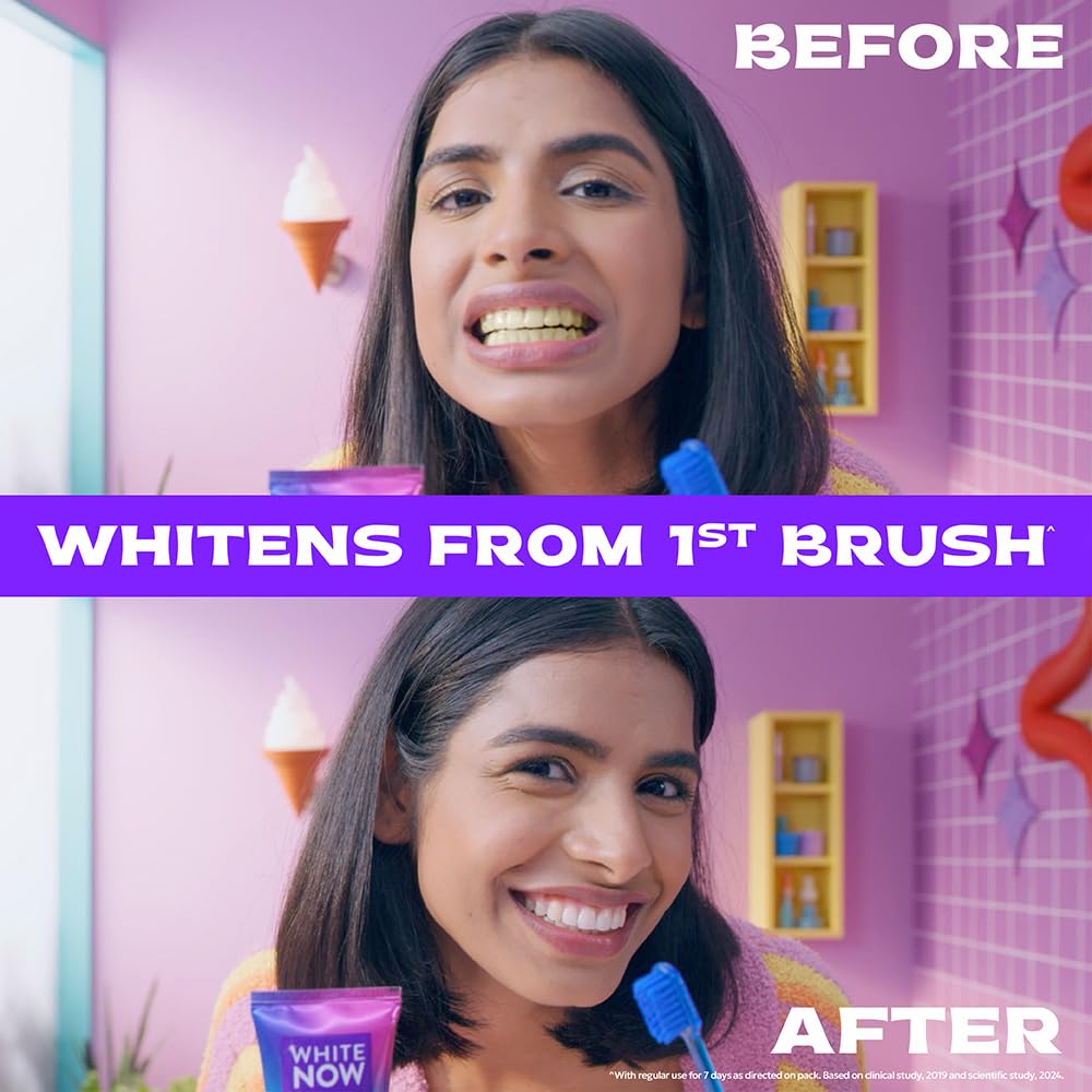 Teeth Whitening Toothpaste: Closeup White Now purple color corrector effectively removes up to 1 year of yellow stains, leaving your teeth visibly whiter. Experience a brighter smile with every use.