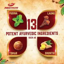 Dabur Red Paste has been clinically tested for reduction in plaque , gingivitis & bad breath . In-vivo study of Dabur Red Paste had been done using healthy subjects. A statistically significant improvement was observed in user when all the four conditions like plaque, gingivitis, stain and malodour were assessed.