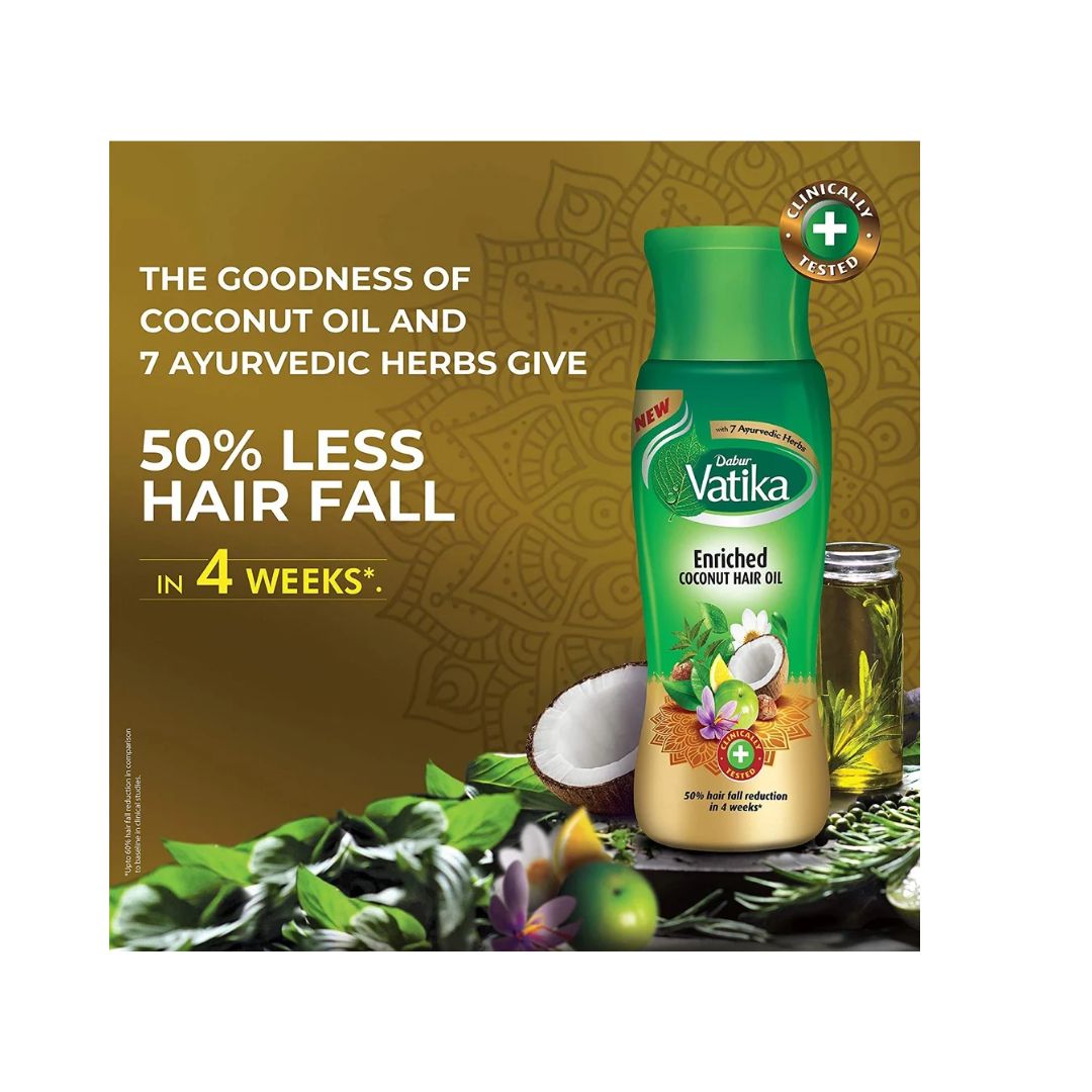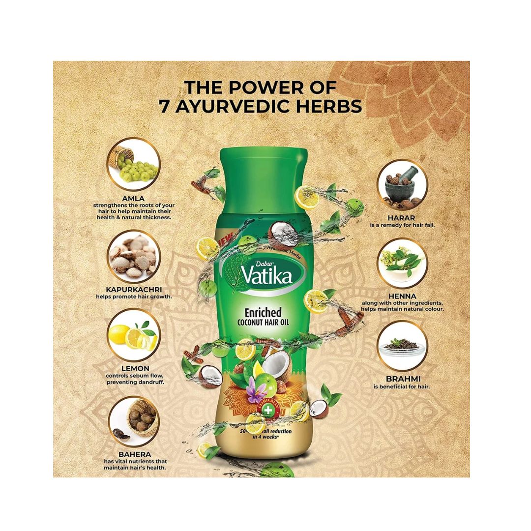 Dabur Vatika Enriched Coconut Hair Oil Pack Of 2 with 7 Ayurvedic Herbs, 50% hair fall reduction in 4 weeks: Net Weight - 300ml, Product Description: A unique blend of Ayurvedic herbs like, Amla, Brahmi, Henna, Kapurkachri, harar & coconut processed by Tail Pack Vidhi, helps in controlling hair fall & rejuvenating scalp. The herbs in this oil balance the aggravating Dohas * Render Natural growth of your hair. Amla: Strengthens the roots of your hair to help maintain their health & natural thickness. Kapurkachri: helps strengthen hair from root to tip. Lemon: Controls sebum flow, preventing dandruff. Harar: is a good remedy for hair fall. Henna: along with other ingredients, helps maintain natural colour. Bahera: has vital nutrients that maintain hairs health. Brahmi: is beneficial for hair.