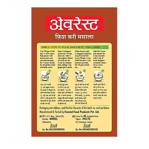 A fine blend of spices like Chilli, Coriander, Tamarind, Cumin and Garlic, among many more, Everest Fish Curry Masala lends great taste, colour and texture to your fish curry. The blend uses pure spices in such accurate measures that it brings out the best in your favourite fish. And makes it ready in no time!