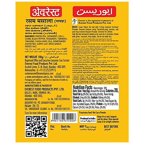 Every South Indian feast must have rasam. The special taste of the authentic rasam can be surely brought from the Everest Rasam Masala Powder. A variety of dried herbs and spices are dry roasted and then finely ground into a powder, which is then stored and added to the dish during preparation. Buy this product online today.