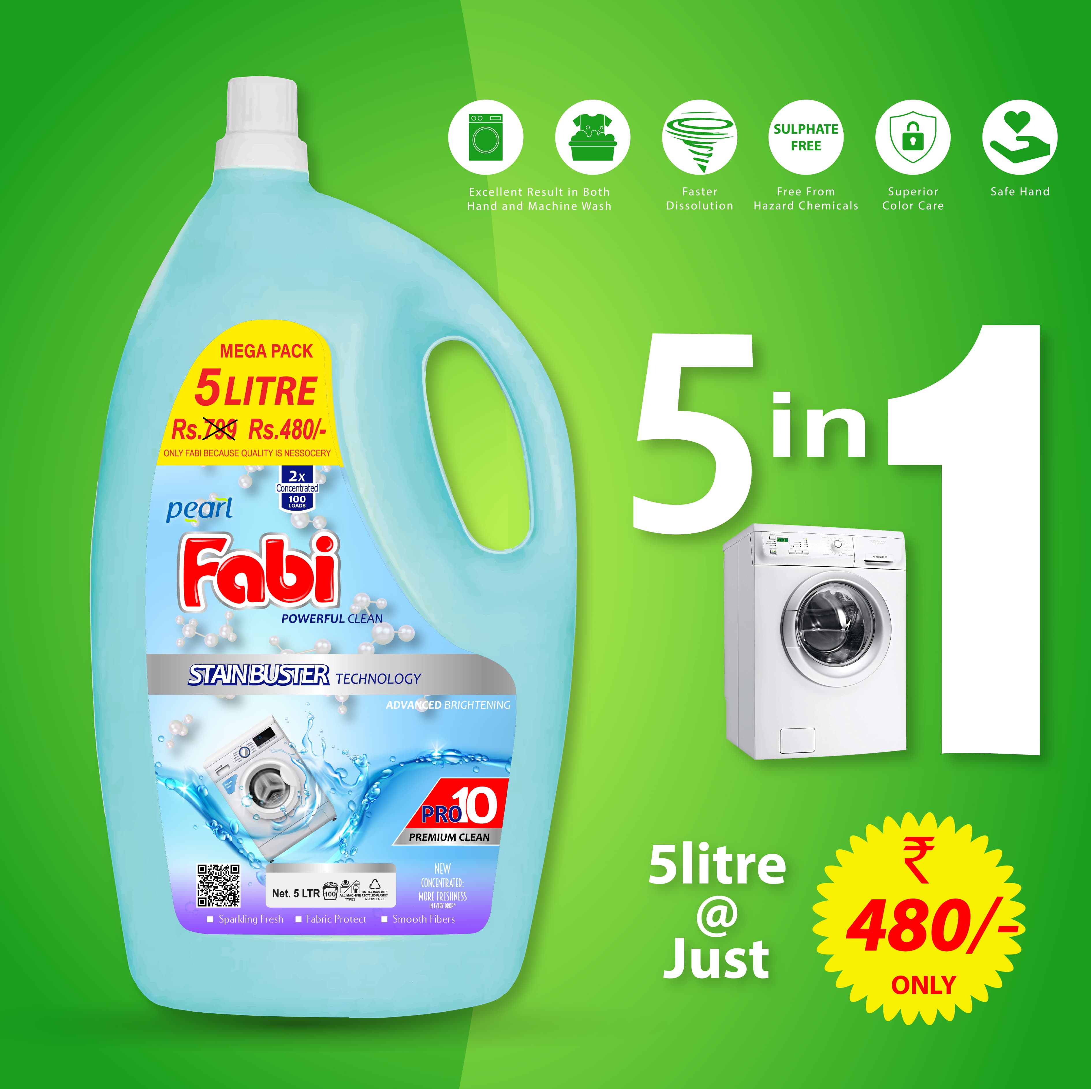 Fabi liquid detergent can remove stains, soften clothes, and leave a pleasant fragrance. It can be used for both hand and machine washing. (BUY 5 LTR GET 1 LTR FREE)