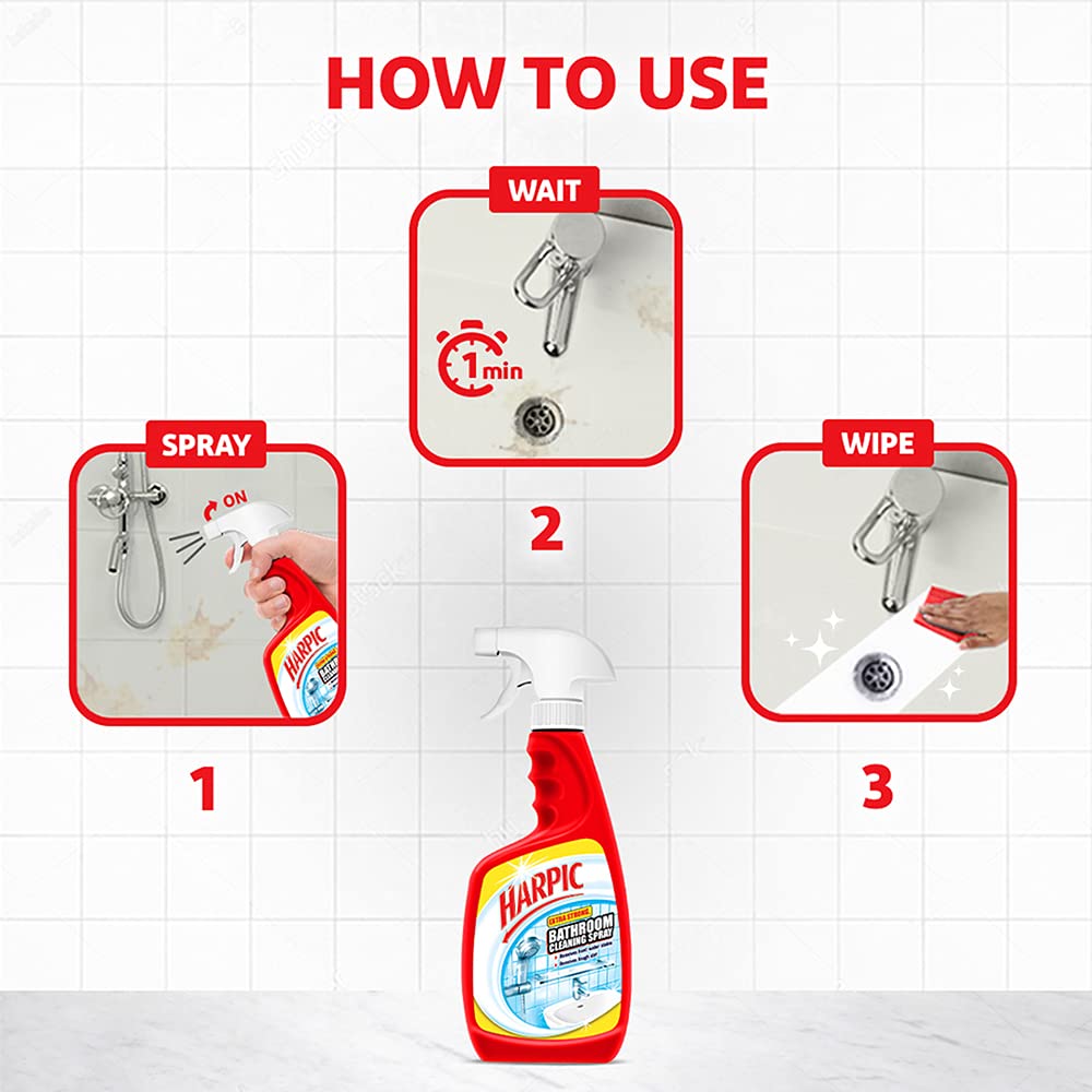 Harpic Extra Strong Bathroom Cleaning Spray deep cleans bathroom surfaces with unbeatable shine every time. The thick liquid provides a powerful deep cleaning action that works instantly to lift away the toughest bathroom dirt, limescale deposits and scum. It effectively disinfects your bathroom, killing up to 99.9 percent germs^ and leaving your faucets, walls and other surfaces visibly clean. With its unique fragrance, it is a dose of freshness for your bathroom every time you clean it. This product can be used as an effective basin cleaner and also a tile cleaner for a fresh, shiny bathroom. Harpic Bathroom Cleaning Spray has an easy to use spray bottle to reach even the toughest spots. It is suitable to be used on Tiles, Taps, Tubs & Shower panels, Ceramic surfaces, Stainless steel and Granite Surfaces. No matter how hard you try to keep it clean and healthy, bathroom remains the most illness causing area in the house