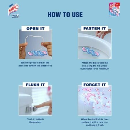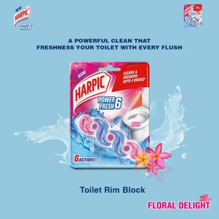 SHINY TOILET: Harpic rim block gives you a shiny toilet LASTS UPTO 4 WEEKS: Toilet Cleaner Rim block that cleans and freshens the toilet for up to 4 weeks WAVE SHAPED: Unique wave shaped block with anti-limescale and easy dirt removal properties COLOURFUL TOILET CLEANER: Colourful and aesthetically pleasing in the bowl PLEASANT FRAGRANCE: Comes in a pleasant floral delight fragrance