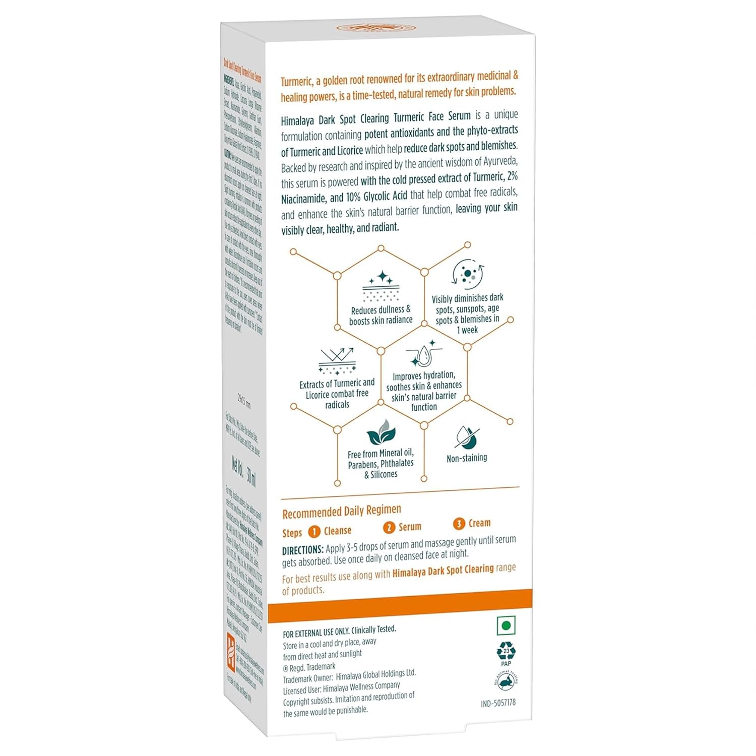 Himalaya Dark Spot Clearing Turmeric Face Serum is a unique formulation containing potent antioxidants and the phyto-extracts of Turmeric and Licorice which help reduce dark spots and blemishes.
