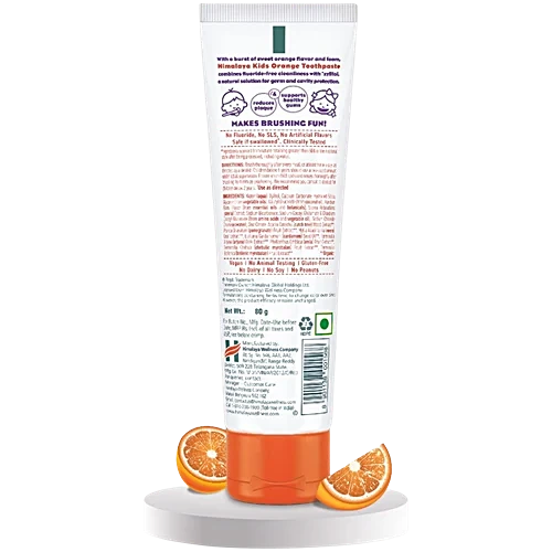 • Himalaya Kids Orange Toothpaste provides fluoride-free cleanliness with Xylitol, a natural solution for germ and cavity protection. Making brushing a fun activity for kids, the toothpaste helps reduce plaque and supports healthy gums. The toothpaste is specially formulated to help protect from dental caries. The product has 99% ingredients of natural origin and is suitable for kids aged from 2-12 years.
