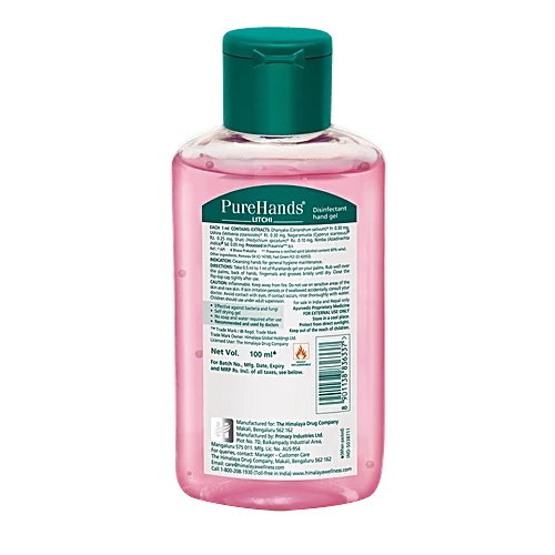 . Himalaya Wellness Pure Hands Hand Sanitizer - Litchi, Kills 99.9% of Germs, Self Drying Gel. Proctects Hands & Kills 99.9% Of Germs. Take 0.5 ml to 1 ml of the gel on your palms Rub well over the palms back of hands fingernails and grooves briskly until dry Close the flip top cap tightly after use.