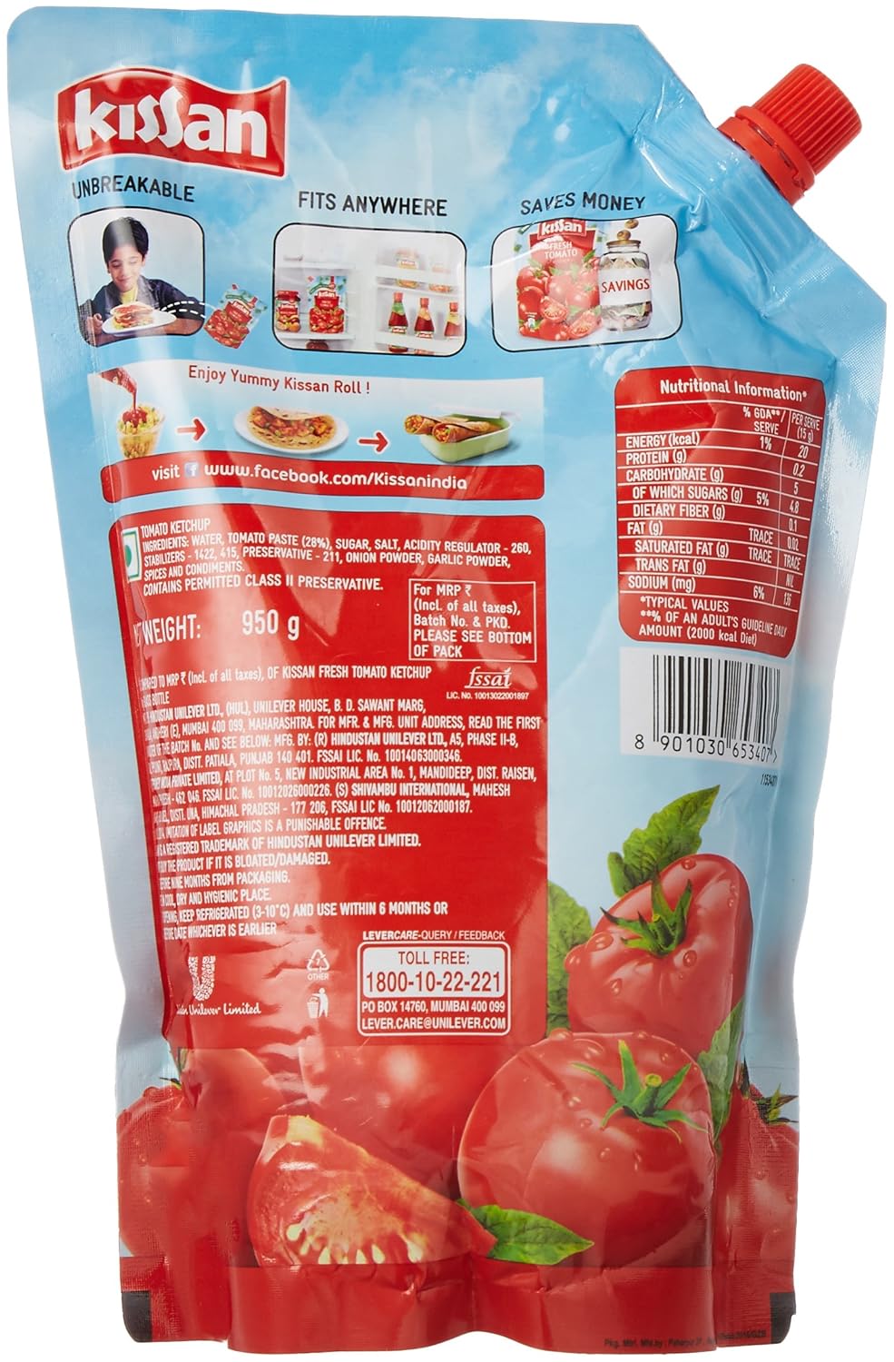 Kissan Fresh Tomato Ketchup is made with 100% real naturally ripened fresh Tomatoes. The Tangy Tomato Ketchup is a must-have at all homes and most loved by Indians! This sauce bottle and pouch packs can either be paired with fries noodles or dhokla. This can be added to almost every dish to make them so much tastier. It’s an assured hero for all the snacks - be it samosas, pakoras, noodles or roti roll – a perfect ally for making wholesome and yummy food. Kissan Tomato ketchup helps healthy foods turn into yummy and tasty for the entire family. You can use this tomato ketchup as a tomato sauce or tomato chutney