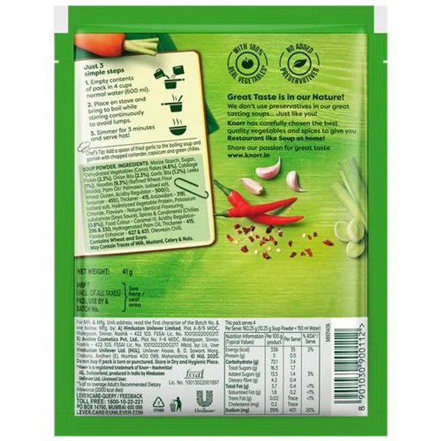 Knorr has hand-picked the best quality vegetables and mixed them with spices to make delicious Knorr Hot & Sour Vegetable Soup. It’s a little hot, a little sour with the bite of crunchy cabbage, carrot and leeks, giving it its lip-smacking taste and perfect consistency every time. Made with 100% real vegetables and no added preservatives, this soup is ready in three simple steps and serves four. So now enjoy Restaurant like delicious Soup at home. Knorr Soups range comprises 11 delicious flavours of 4 serve soups and 7 flavours of Cup-a-soup. Great taste is in our Nature! Knorr has gone to great lengths to ensure a perfect blend of ingredients and consistency that give you a Restaurant Soup at home.