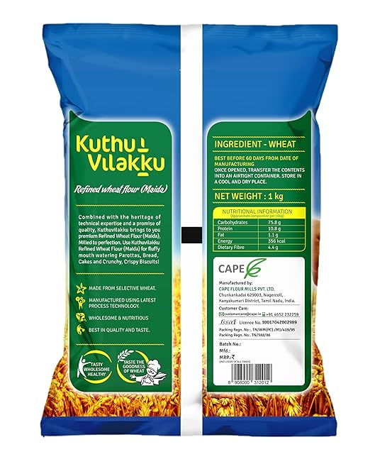 Kuthuvilakku Refined Wheat Flour/Maida is made from 100% wheat grain. Made without any preservatives or artificial colouring. Absolutely pristine and untouched by hand No preservatives or artificial colours Assurance of consistent quality Make soft and fluffy roti's with Kuthuvilakku Whole Wheat Flour.