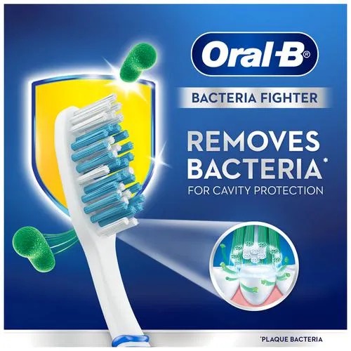 Oral-B Bacterial Fighter Manual Tooth Brush – Cavity Defense, Unique Cup Shaped Soft Bristles The superior cleaning action of Oral-B cavity defence eliminates cavities compared to ordinary brushes. Oral-B cavity defence 123 has unique end-rounded bristles to ensure they are soft on the gums. The unique comfort grip is designed for your needs. The brush has a tongue cleaner for fresher breath.