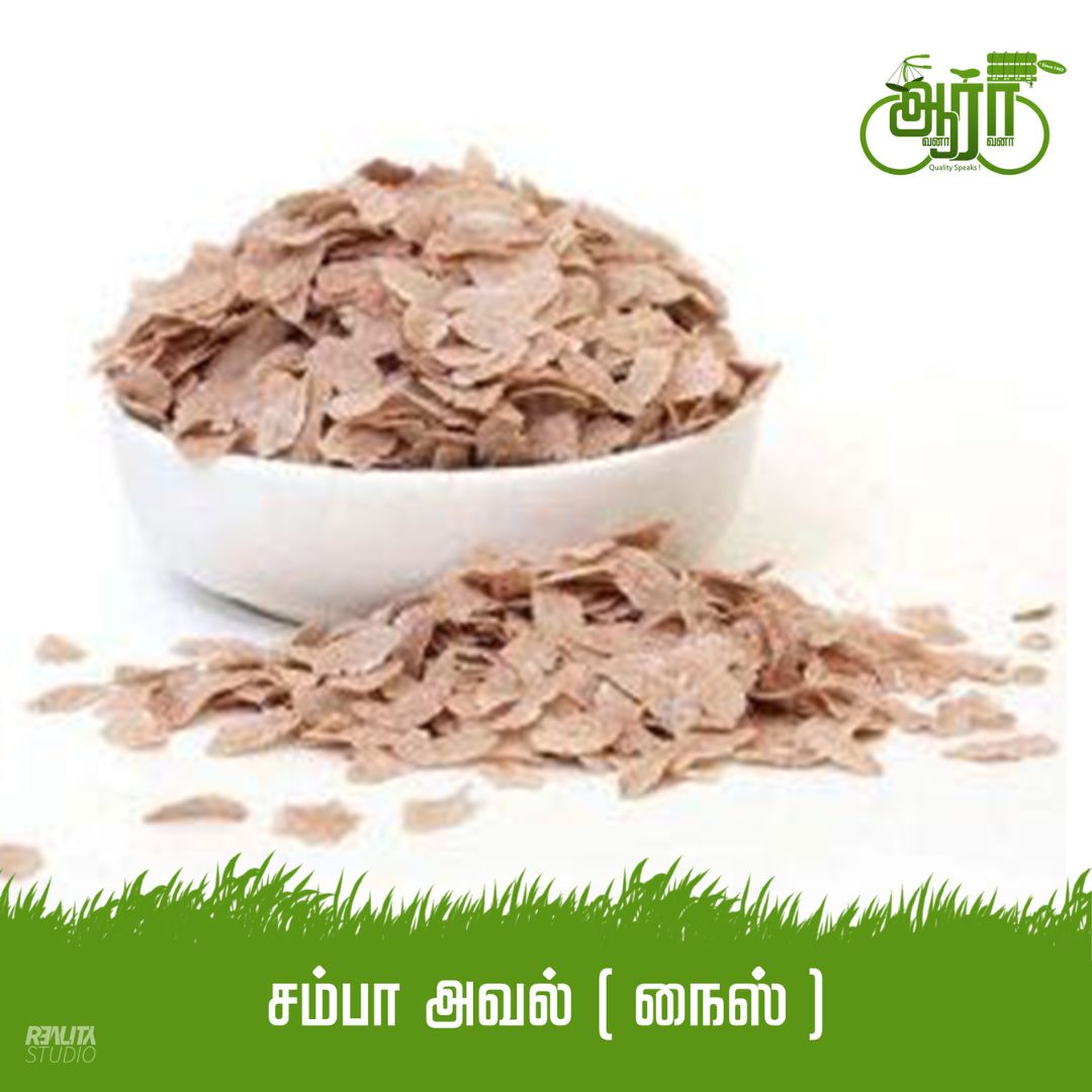 Red rice flakes (Samba Aval) are simply flattened red rice. It has a higher nutritional value than white rice flakes. It has health benefits due to its higher iron content and is also easy to digest. It’s made from red rice. It contains anthocyanin, a flavonoid that does not undergo excessive processing, and as a result, the other bran layer remains intact, which is rich in fibre, vitamin B, and minerals such as calcium, zinc, iron, manganese, magnesium, and so on. சம்பா அவல் சிவப்பு அரிசி மூலம் தயாரிக்கப்படுகிறது. இது வெள்ளை அரிசியை விட அதிக ஊட்டச்சத்து மதிப்பைக் கொண்டுள்ளது. இதில் அதிக இரும்புச் சத்து இருப்பதால் ஆரோக்கிய நன்மைகள் மற்றும் ஜீரணிக்க எளிதானது. இதில் அந்தோசயனின் (anthocyanin) என்ற ஃபிளாவனாய்டு உள்ளது, மேலும் இதில் நார்ச்சத்து, வைட்டமின் பி மற்றும் கால்சியம், துத்தநாகம், இரும்பு, மாங்கனீசு, மெக்னீசியம் போன்ற தாதுக்கள் நிறைந்துள்ளன.
