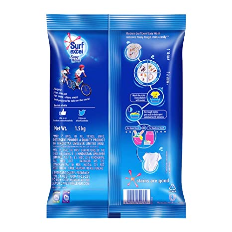 Surf excel Easy Wash is a superfine powder that removes tough stains in a jiffy and leaves no residue on your clothes. Being a superfine and fluffy powder it dissolves easily and reaches the stain and removes it easily. Its engineered formula with a superior technology unleashes the power of 10 Hands that is effective in removing toughest of the stains such as mud, ink, oil, ketchup, curry stain and chocolate very easily.
