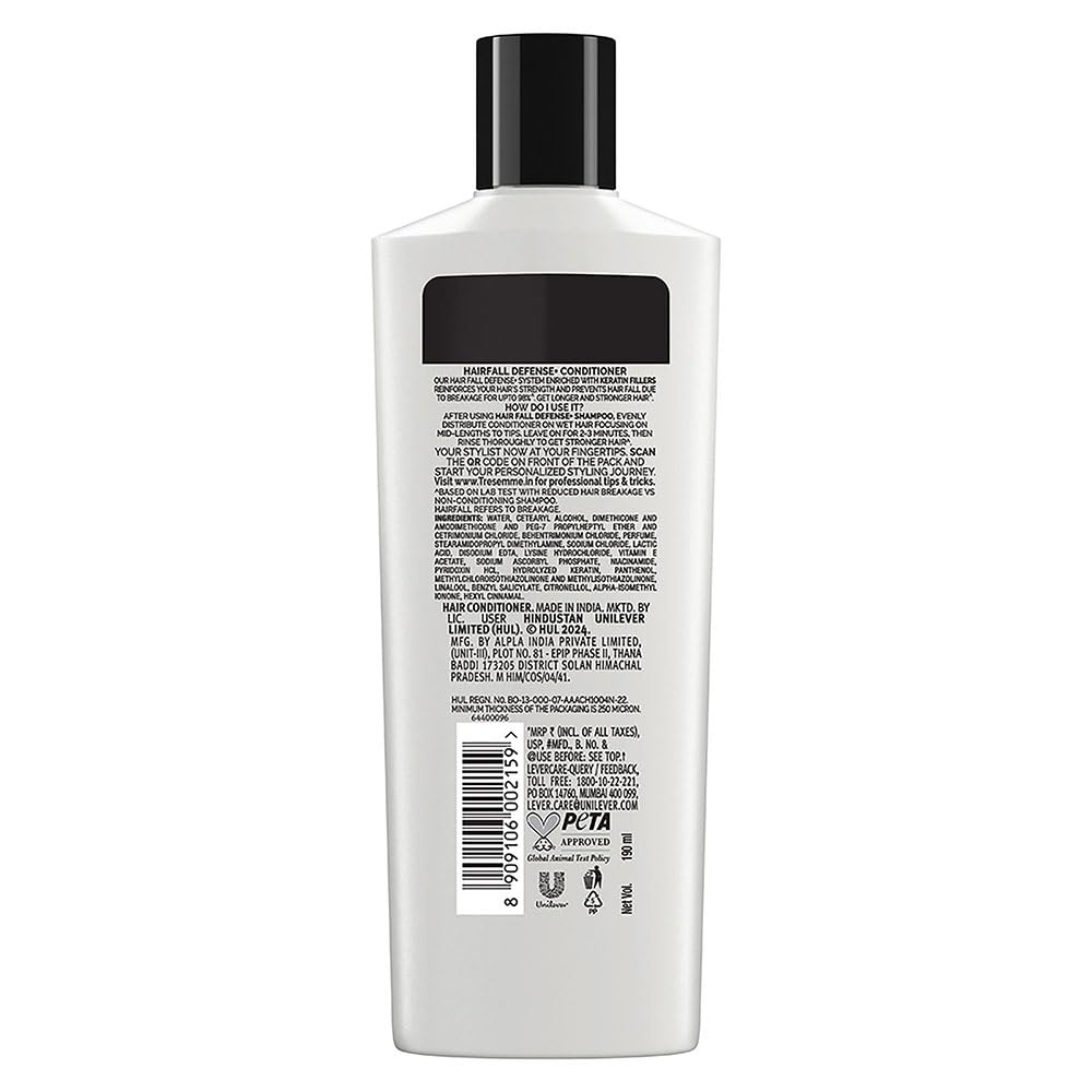 TRESemmé Hair Fall Defense Conditioner helps reinforce your hair strength and prevents hair fall due to breakage. It is infused with Keratin protein which helps in reversing the harsh effects of damaged hair and provides hydration as well as elasticity to your hair. Use this range to get upto 97% less hair breakage after just a single wash. Enriched with advanced quality ingredients, the formula is scientifically constituted to give you longer, stronger, & manageable hair with every wash. Its keratin-enriched lightweight formula deep conditions and detangles distressed hair.