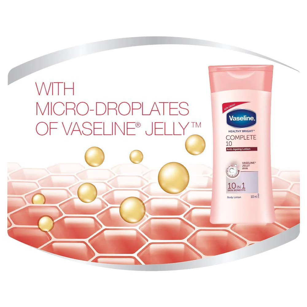 Vaseline Healthy Bright Complete 10 body lotion specially designed to restore moisture for 10-in-1 brightening and anti-ageing skin benefits: Visible skin brightening, even-tone restoration, UVA & UVB protection, dark mark reduction, radiance boost, skin feels firm & tight, visibly reduces fine lines, helps skin renewal, intense moisturisation and deep nourishment