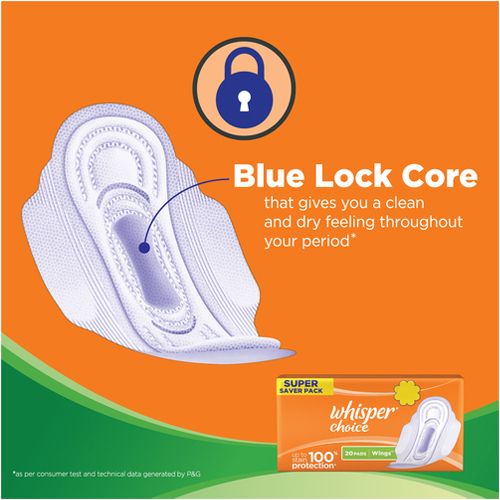 Whisper Sanitary Pads – Choice Wings Regular Whisper Choice Sanitary Pads helps you get upto 100% stain protection. This revolutionary pad has wings which keep the pad in place. Dont worry about stains and be unstoppable.