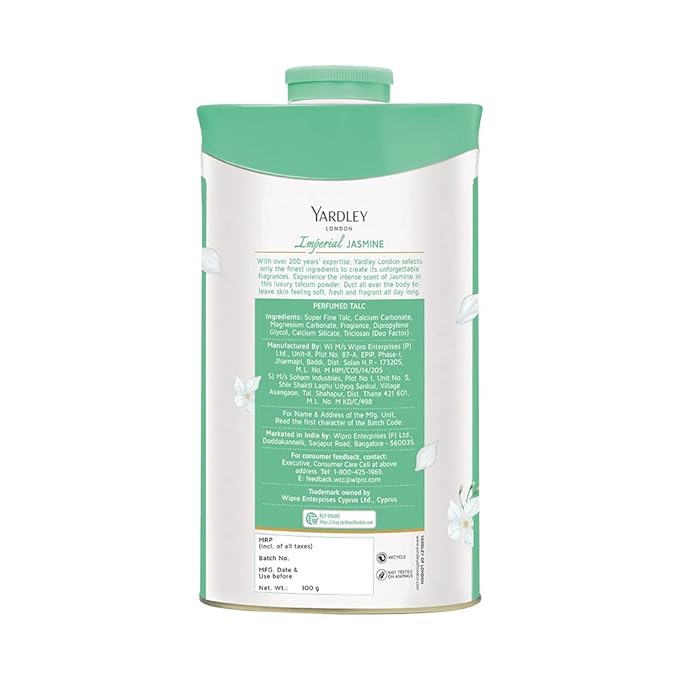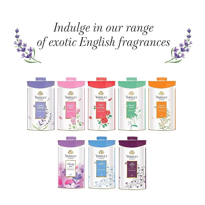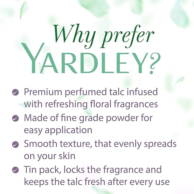 About this item Apply all over the body after shower for fresh feel Luxury perfumed talc leaves your skin feeling soft and fragrant all day Enjoy the contemporary, elegant, sophisticated feel with the Gold range of Yardley Talc. As refreshing as ever. Designed to suit all