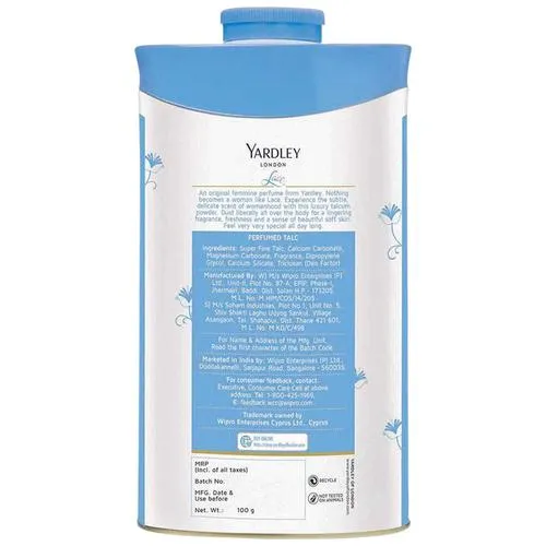 Yardley lace Talcum Powder Perfumed talcum powder for men featuring a modern masculine fragrance. This grooming talc keeps you odour-free and feeling fresh all day long. It helps keeps skin dry, soft and smooth resulting in a refreshing feeling.